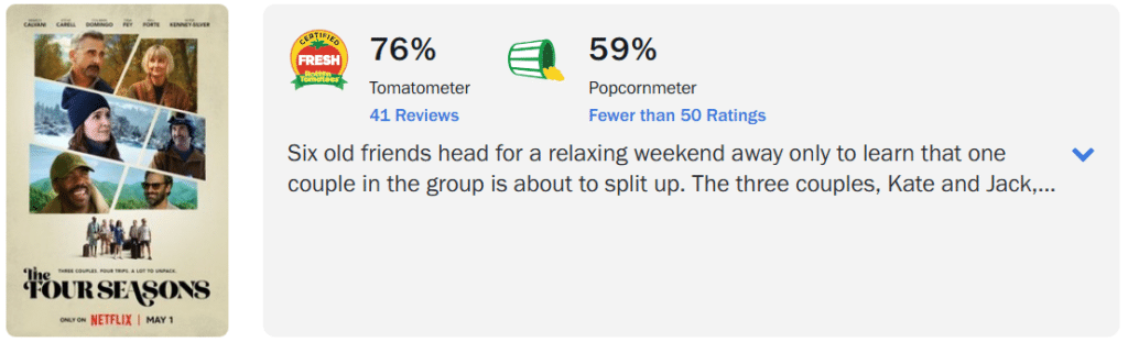Com o público, a situação de As Quatro Estações do Ano foi ainda mais complicada, com a série alcançando apenas 59% de aprovação. Resta aguardar para saber se o desempenho pode melhorar com o tempo, caso a produção finalmente consiga encontrar o público certo no streaming.